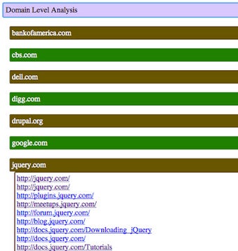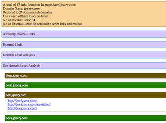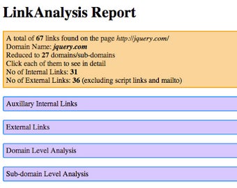 LinkAnalysis performs analysis at two levels: the top domain level and the sub-directory level. It enables users to gather all external links at once, while also displaying internal links. The add-on excludes JavaScript links and mailto links in the external links section, but users can still view them in the domain and sub-domain level analysis of the page.